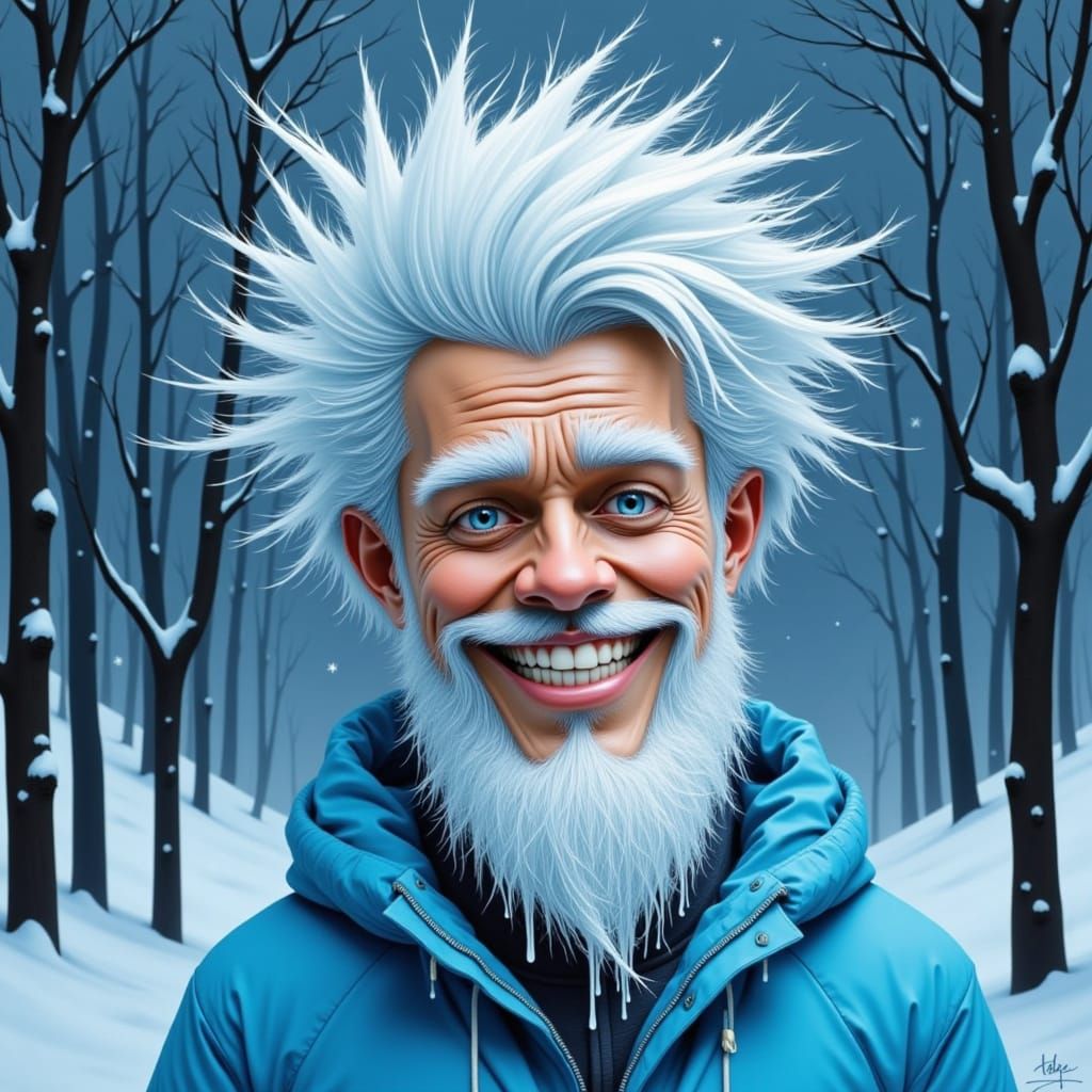 This image depicts a humorous, tall, thin man in a light blue jacket with frosty white hair and icicles. It features a detailed, realistic winter storm with cinematic lighting and volumetric fog.