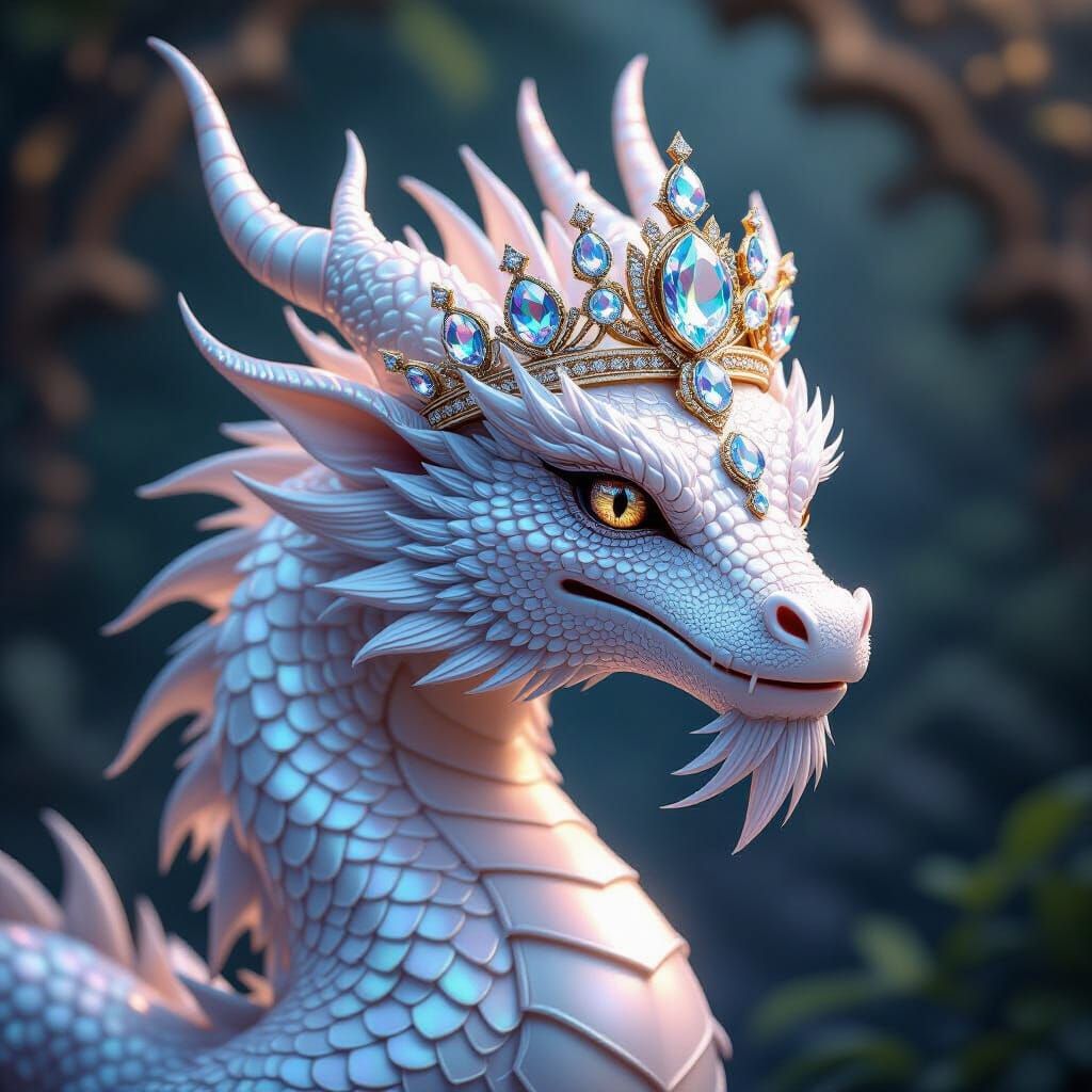 This image features a regal pearl dragon wearing a crown of brilliant diamonds. Rendered as detailed fantasy concept art with dramatic lighting and rich colors.