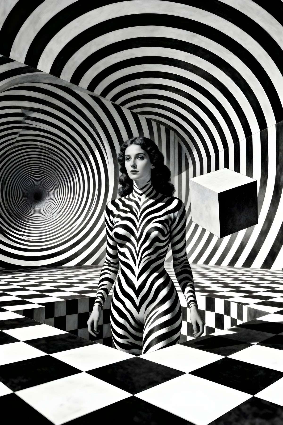 This image shows a woman seamlessly blending into a monochrome labyrinth of optical illusions. Geometric patterns and impossible architecture create a surreal, hyperrealistic scene with sharp focus.
