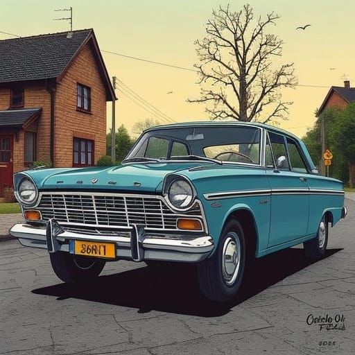 This image shows a 1966 Ford Cortina Deluxe in motion. The artwork features bold lines, high contrast, and vibrant colors, rendered in a manga or anime style with exaggerated shading.