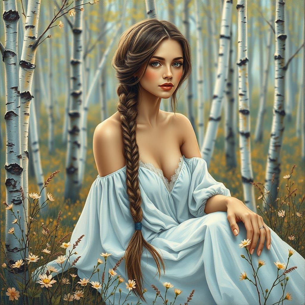 A vivid image of a woman with braided hair in a white dress, sitting in a birch forest surrounded by flowers. The artwork is rich in detail and color, with a sensual, magical feel.