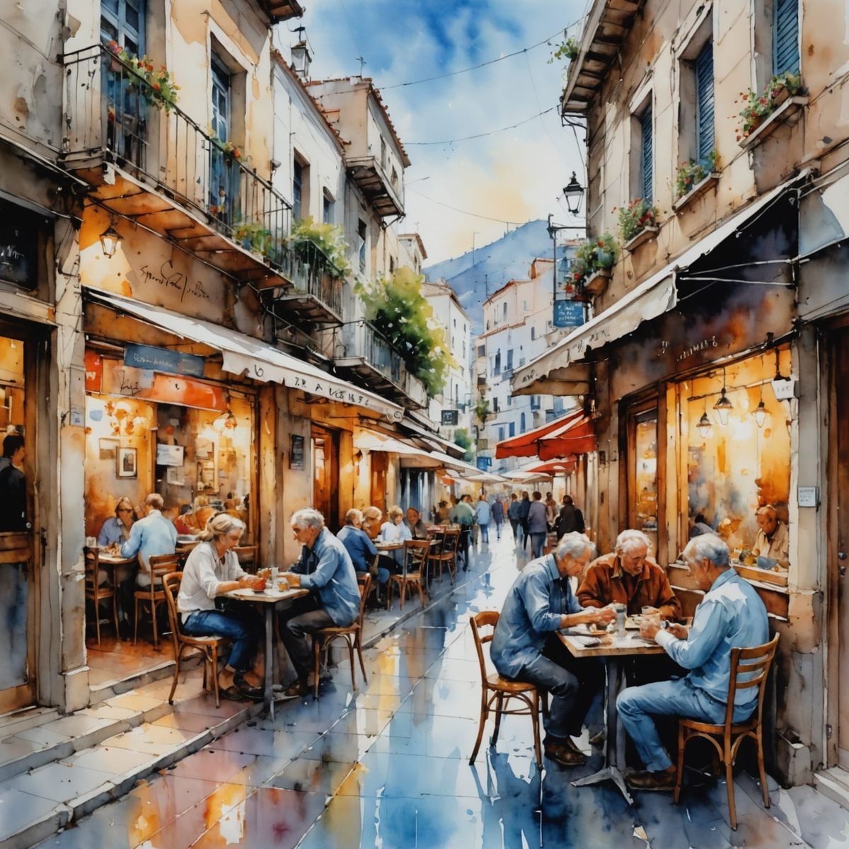 Generate your own unique watercolor paintings of pavement cafes and Anafiotika, Athens. Free and easy to use!