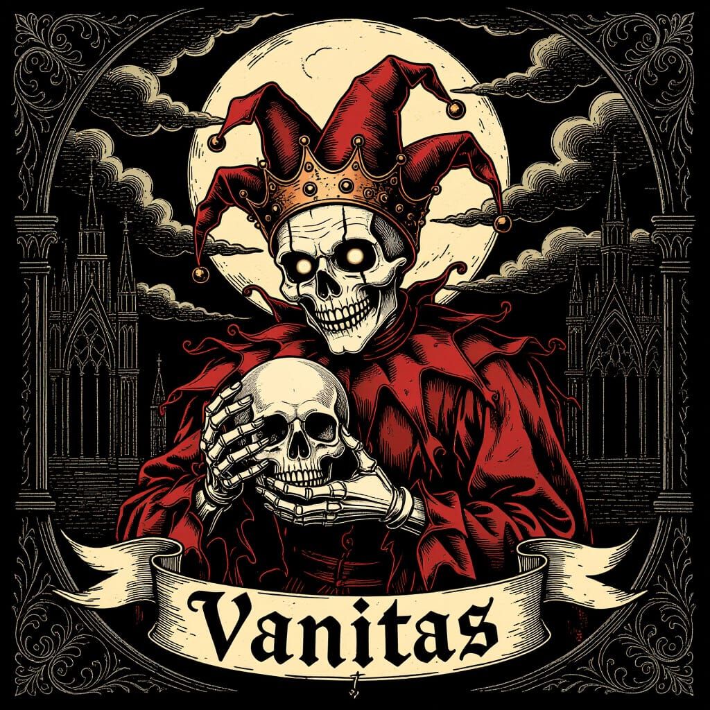 A vintage engraving of a skeletal jester holding a skull. The gothic scene features swirling architecture, dark clouds, and a banner with gothic typography, illuminated by spectral moonlight.