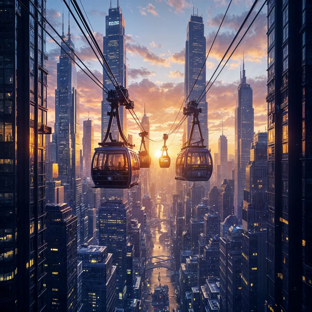 This image shows a breathtaking futuristic city at sunset, featuring towering skyscrapers and cable cars. Rendered in a detailed matte painting style with deep colors and intricate details.