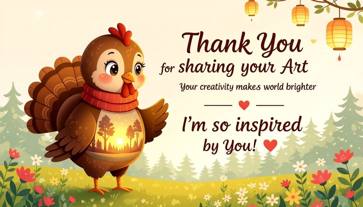 A cute anthropomorphic creature — turkey — standing gracefully, wearing a cozy scarf or simple outfit, rendered in soft painterly detail. Th...