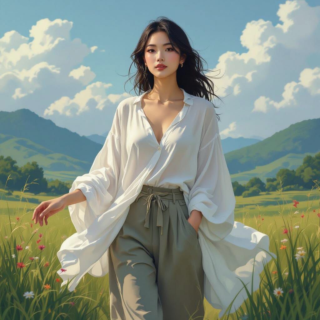 A digital painting of a woman in a flowing white shirt and loose pants in a serene landscape. The artwork features whimsical, dreamy qualities and vibrant colors.
