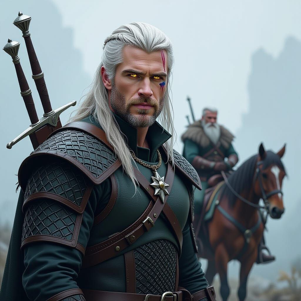 A digital painting depicts Geralt and Vesemir on horseback in a dark fantasy style. Detailed textures and atmospheric lighting create a dramatic scene. The characters are rendered with striking realism.