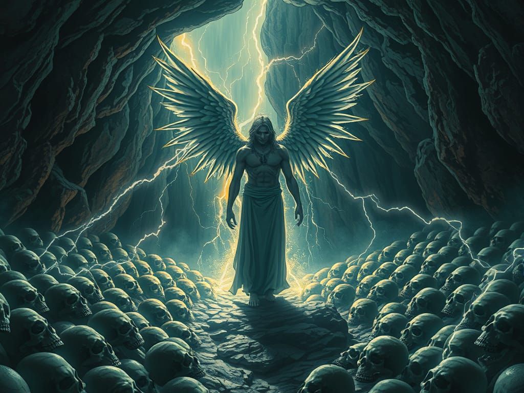 A dramatic image of a fallen angel in a skull-filled cave. Lightning illuminates the scene with deep contrasting colors, in a dark manga art style.