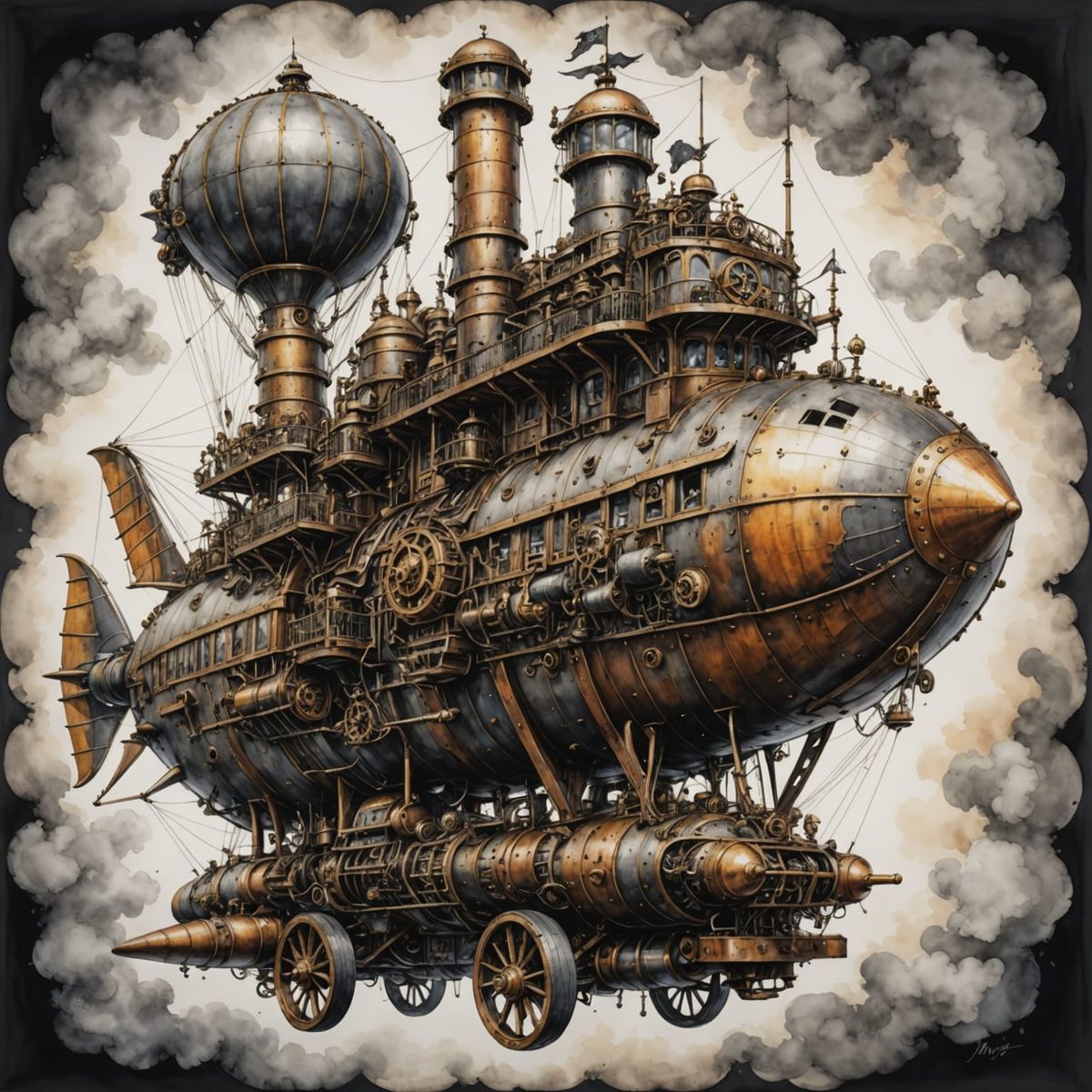 A striking picture of a steampunk airship with intricate details. The image showcases a hyperdetailed charcoal drawing with watercolor splash effects, emphasizing the complex steampunk engine.