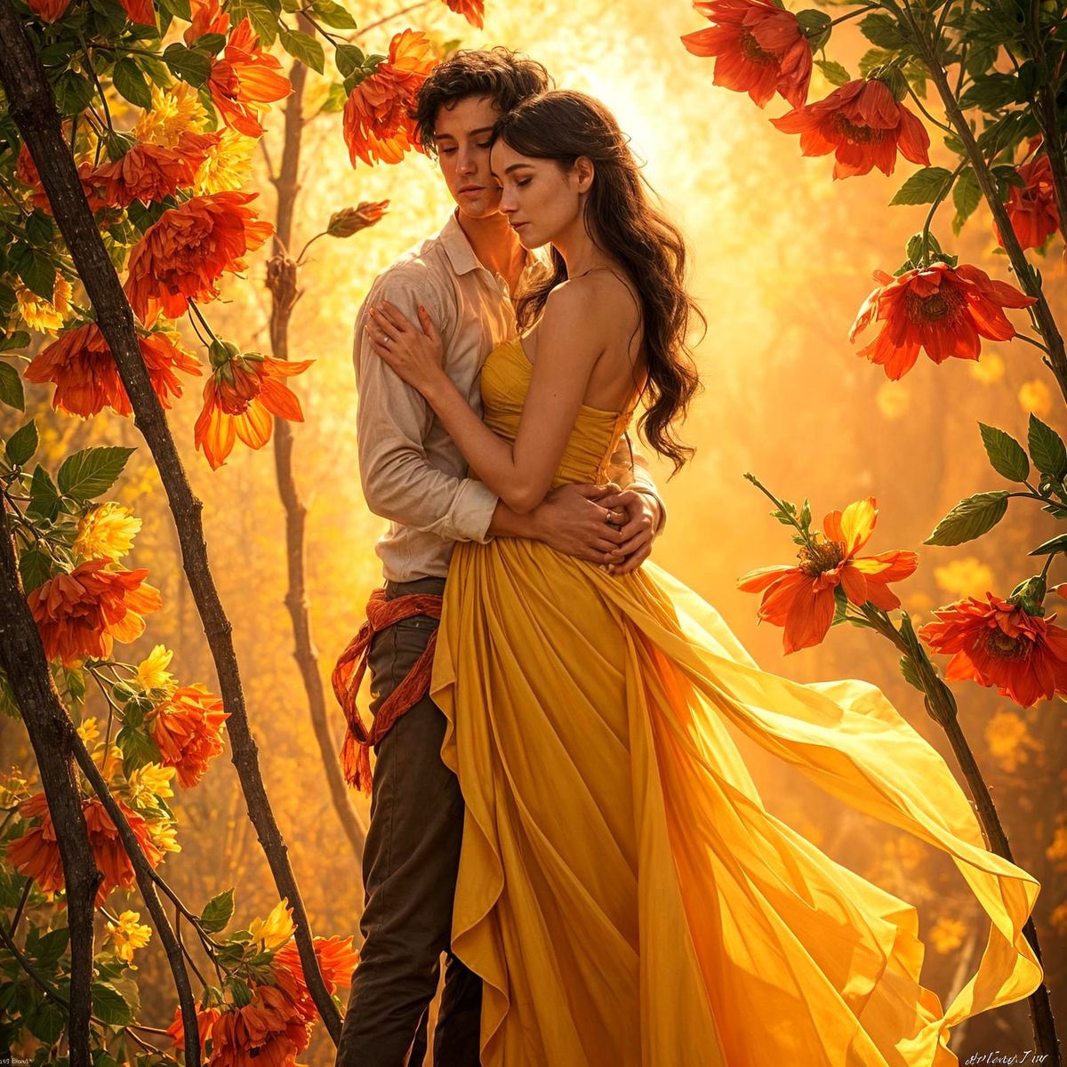 This image shows a passionate embrace between a young couple amidst vibrant, fiery flowers. The artwork evokes feelings of love and a long-awaited reunion.