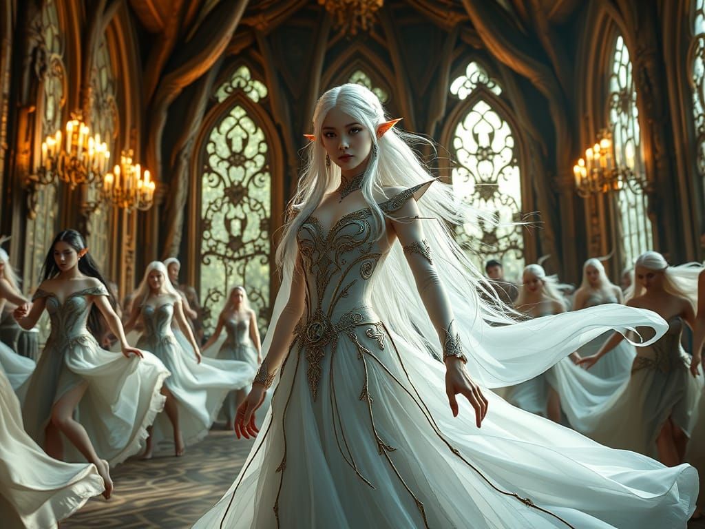 This image depicts a regal elf princess in a stunning white-gold and blue gown, surrounded by elegant dancers in a ballroom with walls made of living wood, rendered in photorealistic detail with soft, cinematic lighting.