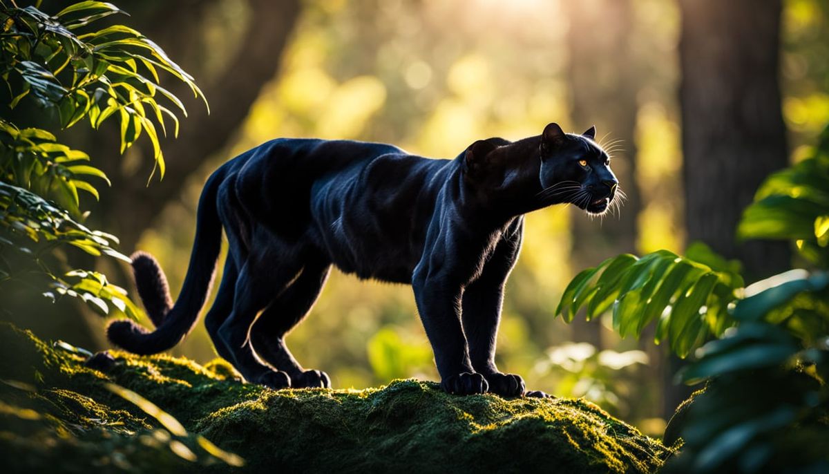 A striking picture of a black panther in its natural habitat. The macro photography captures the panther in incredible detail, set against a blurred background of lush foliage in golden hour light.