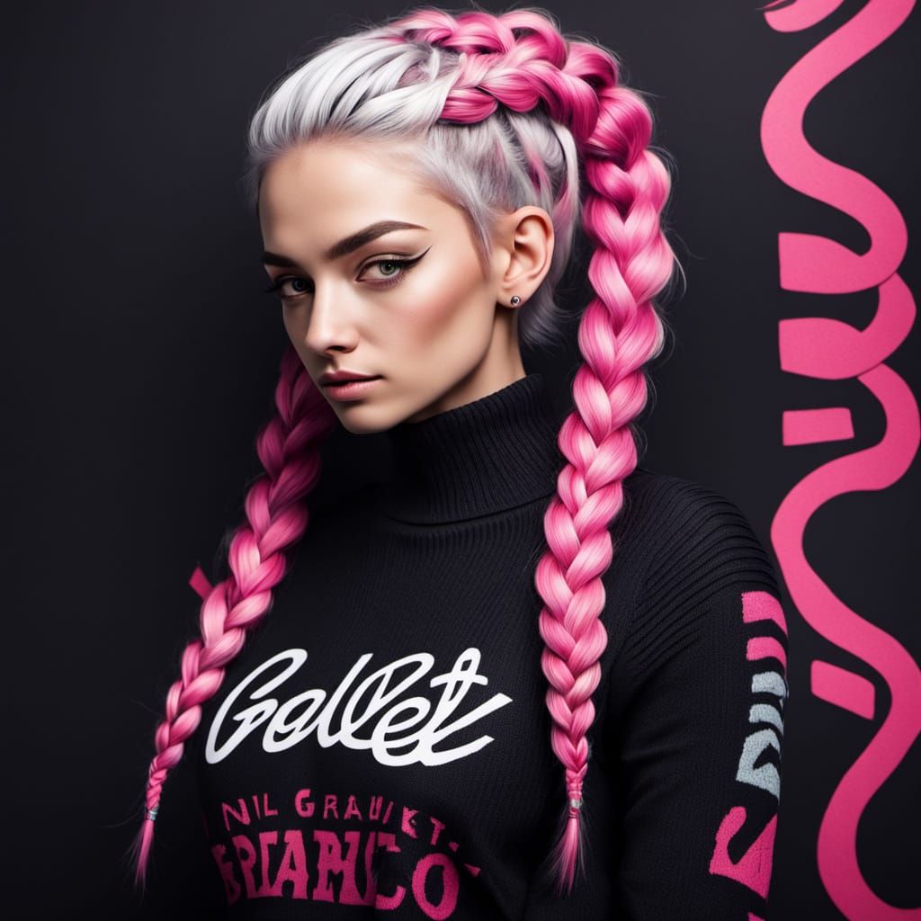 This image shows a playful, cartoonish depiction of a punk girl with braided platinum hair, posing in front of vibrant calligraphy patterns on a black background with neon accents.