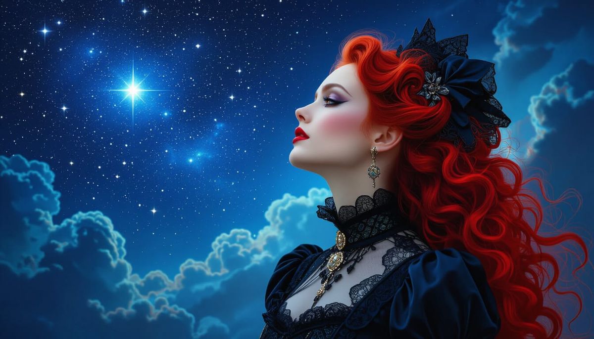 A captivating image of a gothic woman with crimson hair gazing at a star-filled night. The scene evokes classic gothic art with cosmic and dreamlike influences in mixed media.