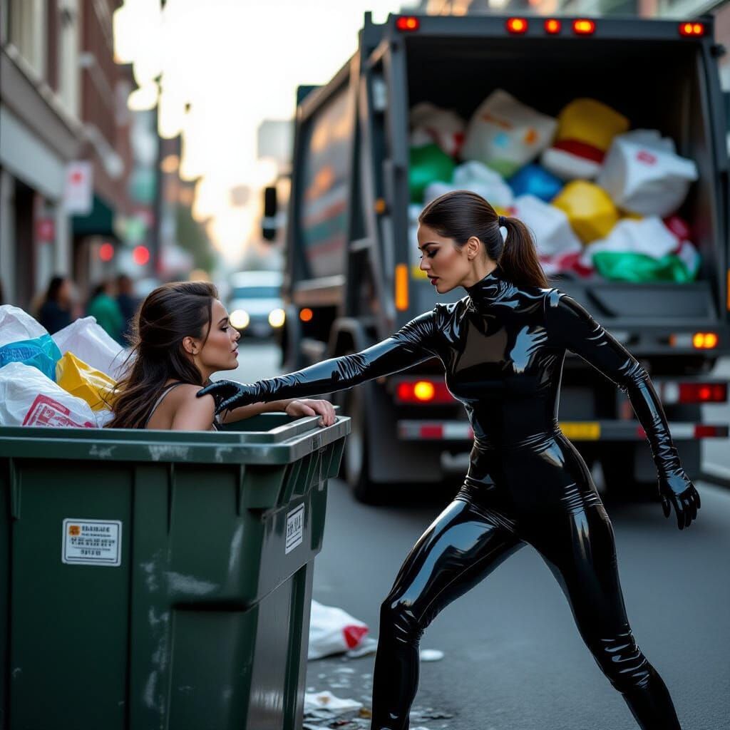This image shows a woman in a black latex jumpsuit throwing another woman into a dumpster. A garbage truck loaded with garbage bags waits nearby, captured with professional photography techniques and a shallow depth of field.