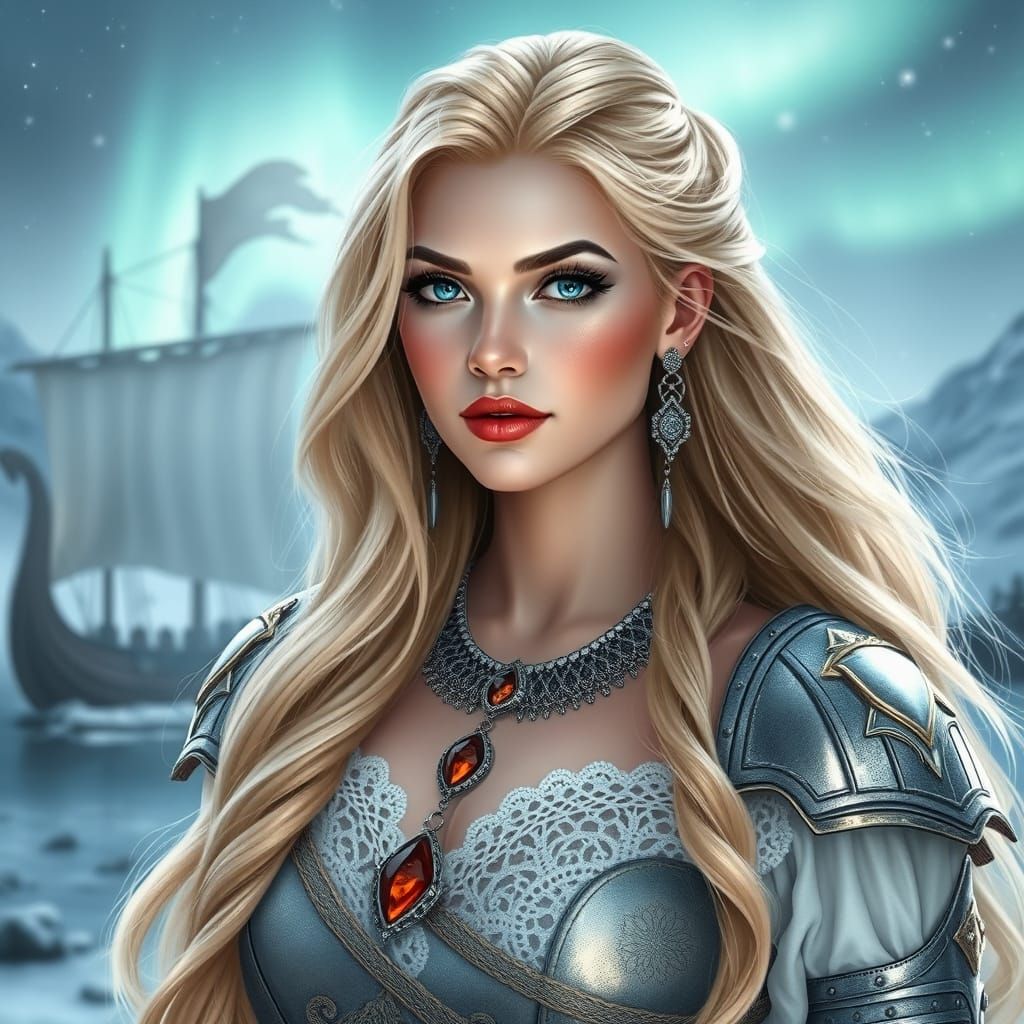 This image shows a stunning female figure adorned in regal attire, blending ancient Viking armor with elegant, flowing dress and sparkling jewelry. Against a backdrop of aurora borealis and a snowy longship, the goddess exudes mystique and power.