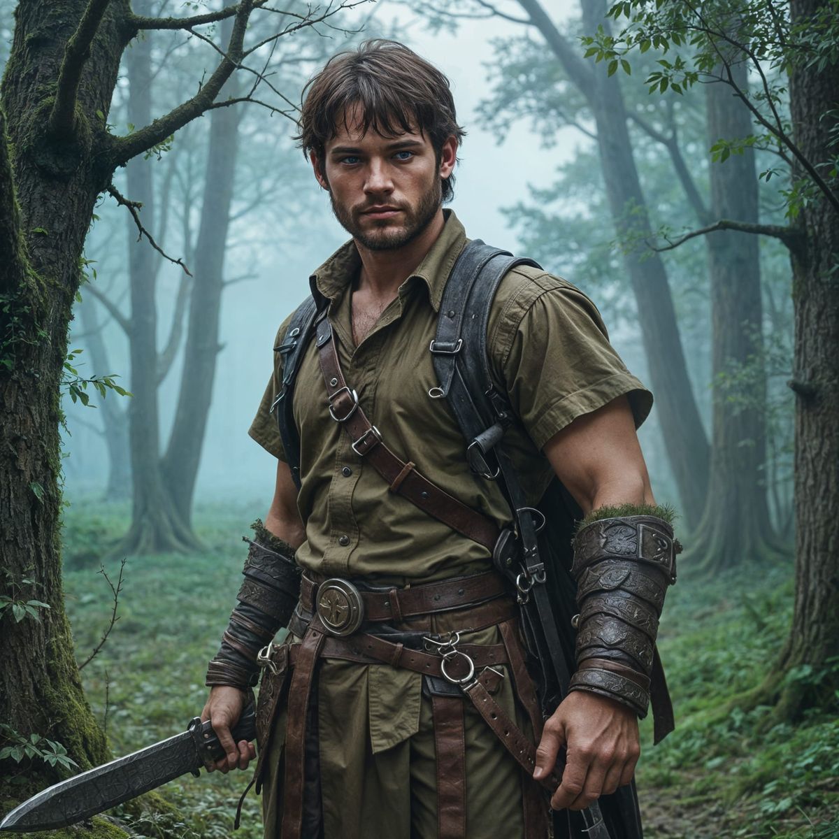 This image shows a realistic portrait of a halfling barbarian in a forest setting. The character has short brown hair, blue eyes, and a beardless face.