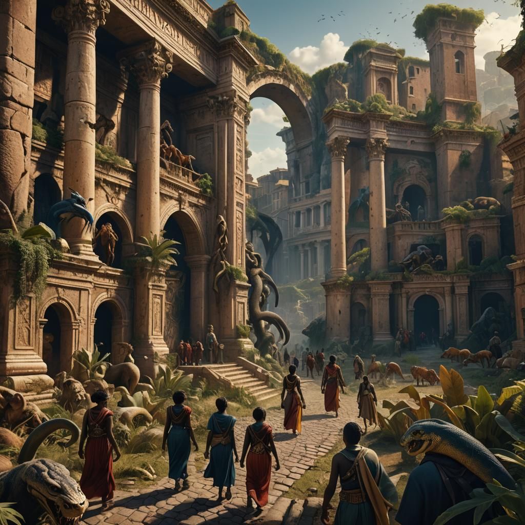 This image shows African women entering Rome accompanied by wild animals, snakes, and their families. The artwork features deep colors and intricate details, reminiscent of fantasy concept art.
