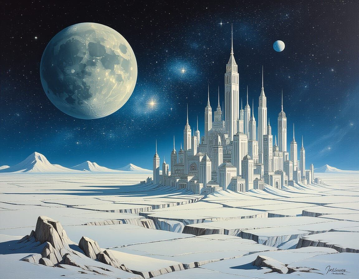 A magical silver and sapphire city on the moon, set against a wide space nebula. This retro sci-fi scene evokes the detailed realism of early Netherlandish painting.