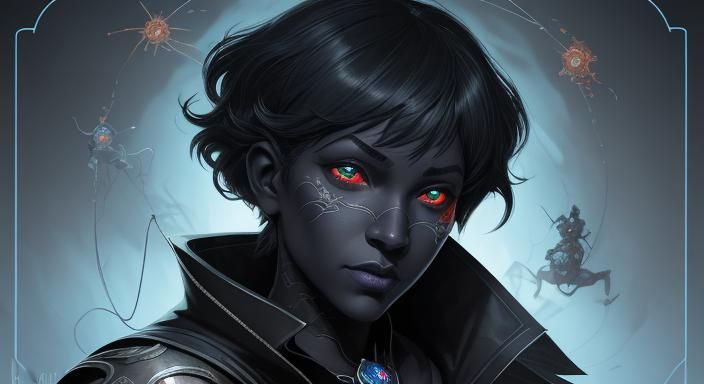 A striking image of a dark-skinned drow nun in the style of classic comic book art. The character features spider web makeup and jewelry, with alchemical and biopunk elements.