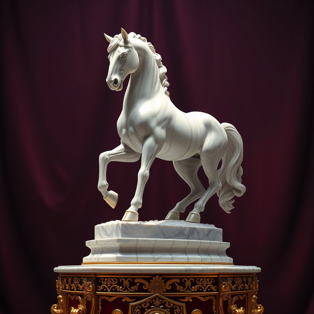 A striking picture of a horse statuette crafted from striated Carrara marble, presented on a gilded podium. The artwork features dramatic lighting and rich colors, reminiscent of a fantasy video game splash screen.