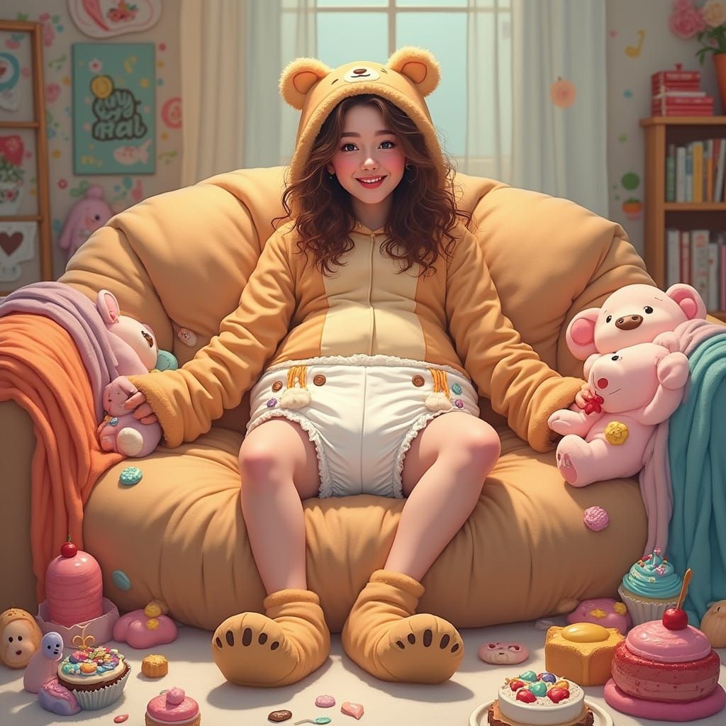 This image shows a smiling woman in a whimsical living room surrounded by toys, treats, and a cozy atmosphere, featuring a cartoonish diaper and bear onesie in a vibrant, playful style