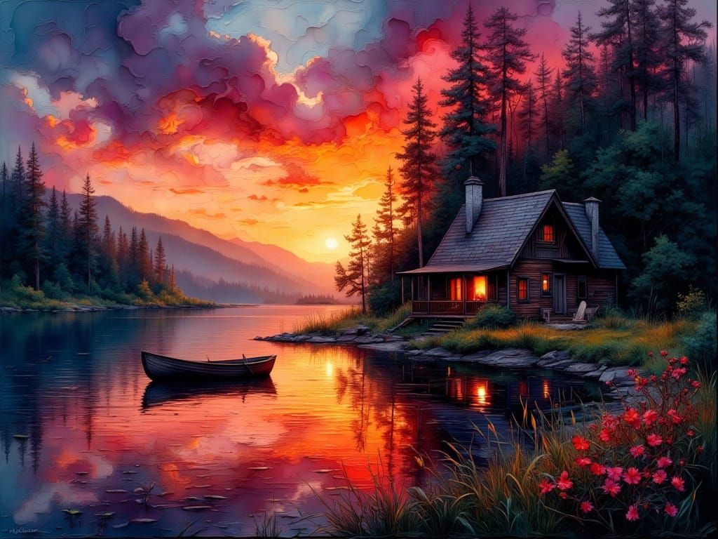 This image shows a dramatic sunset with fiery colors reflected on a still lake. A cozy cabin sits by the shore, surrounded by dense foliage and wildflowers, rendered in an impressionistic oil painting style.