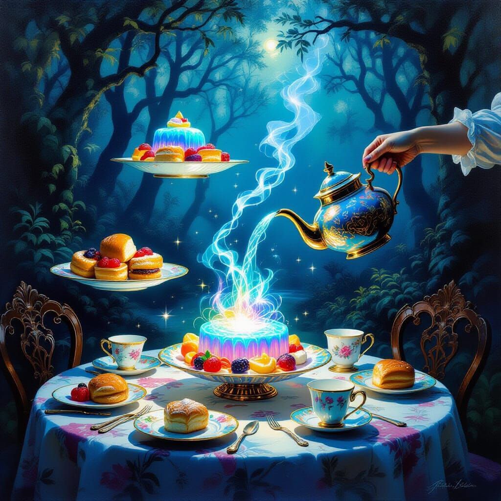 This surrealist oil painting depicts a table filled with magical food, featuring levitating platters and a glowing dessert. An ornate teapot pours iridescent liquid, set against a dark, enchanted forest.