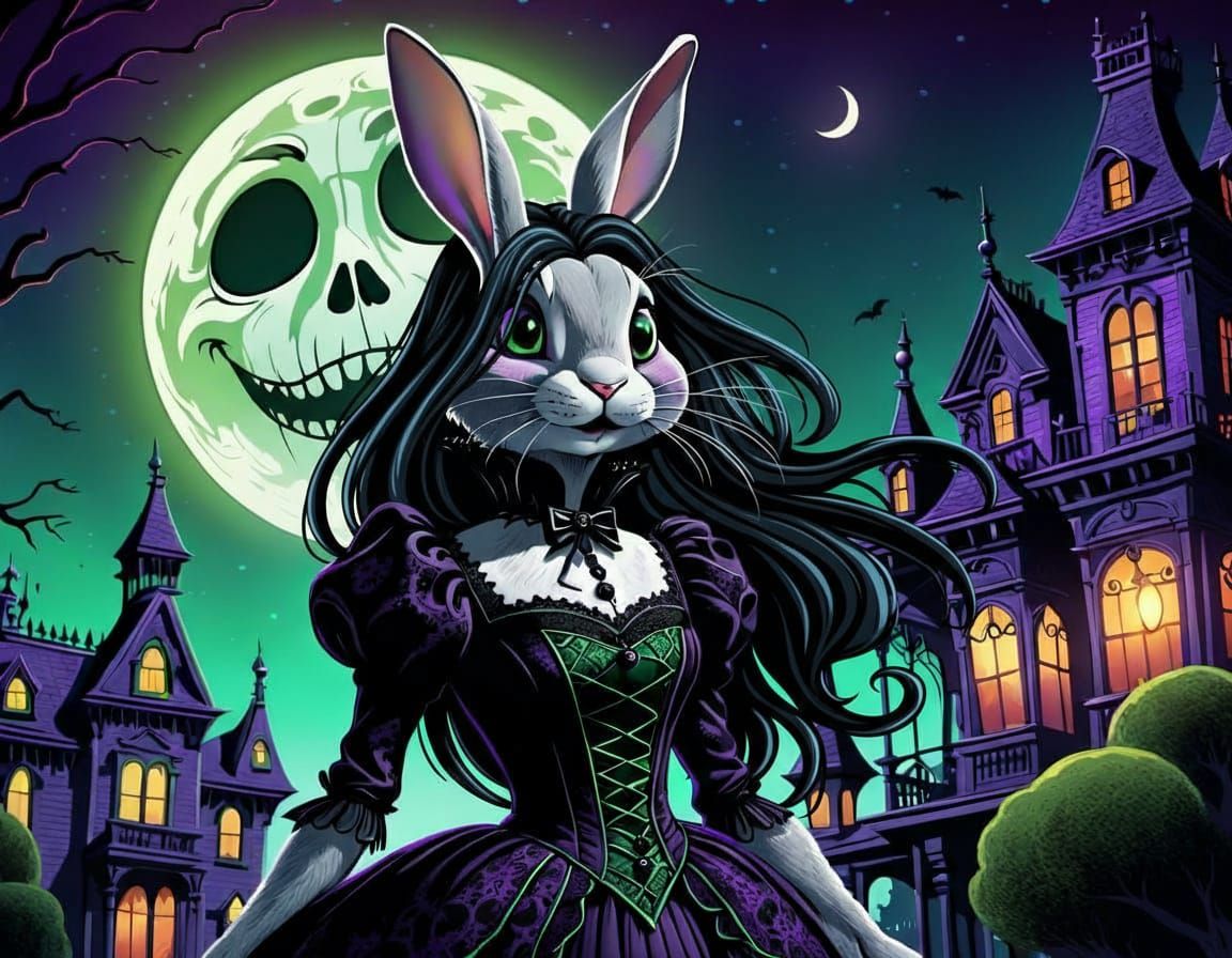 Created for a challenge about Gothic Rabbits. My prompt called for the cartoon style of Friz Freleng.