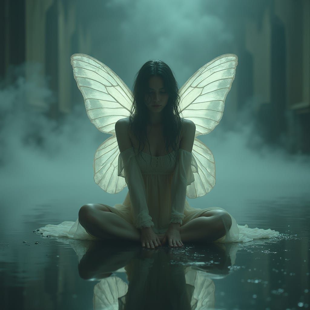 A surreal image of a winged woman in a derelict ballroom filled with water. The soft focus and muted colors create an eerie, ethereal atmosphere, reminiscent of digital painting.
