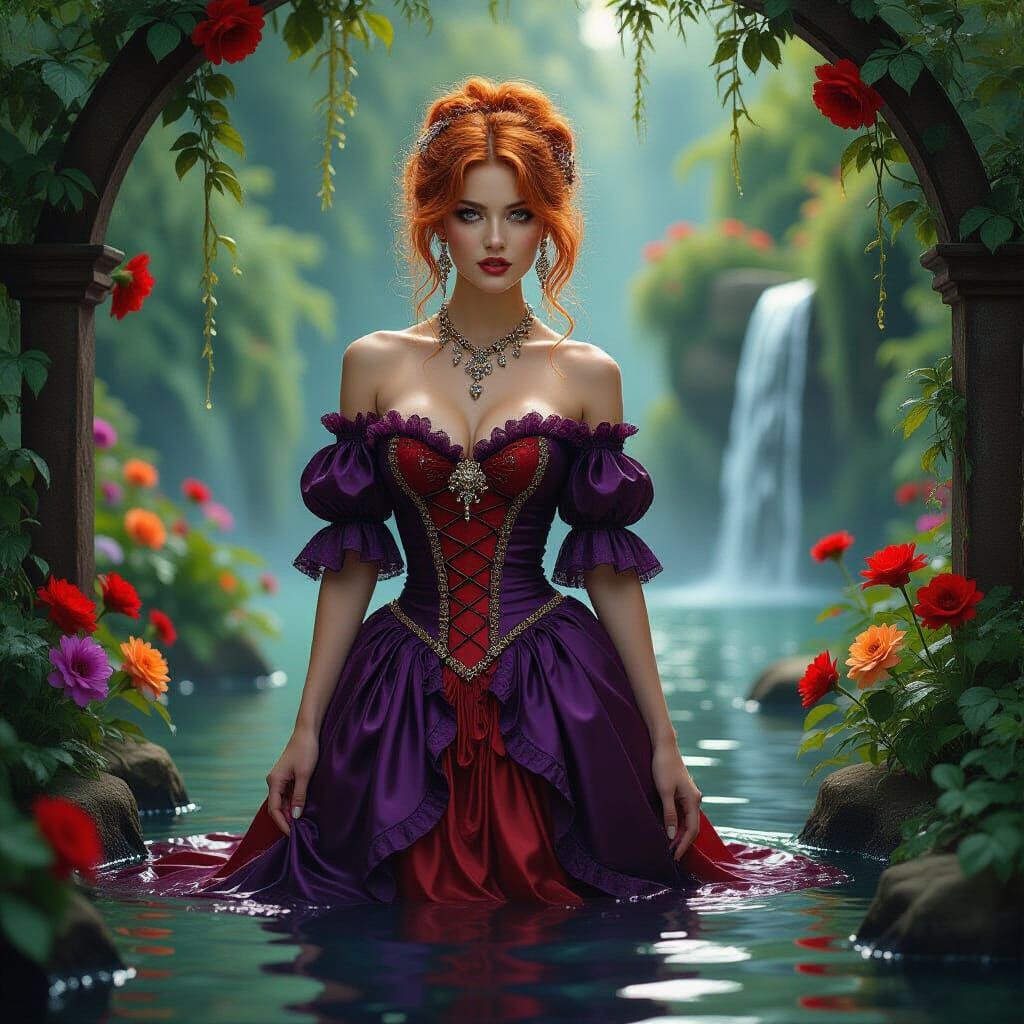 alcohol ink painting on silk, sprayed with Luminol, Pre-Raphaelite lady with messy orange hair, purple and red lace gown, fancy jewels, garden, flowers, waterfall, wet botanical, emotional, moody, romanticism, hdr