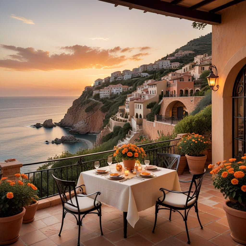 This image shows a picturesque outdoor dining patio at sunset with warm golden light. The patio overlooks a Mediterranean town with a brilliant ocean view, detailed with warm light on buildings.