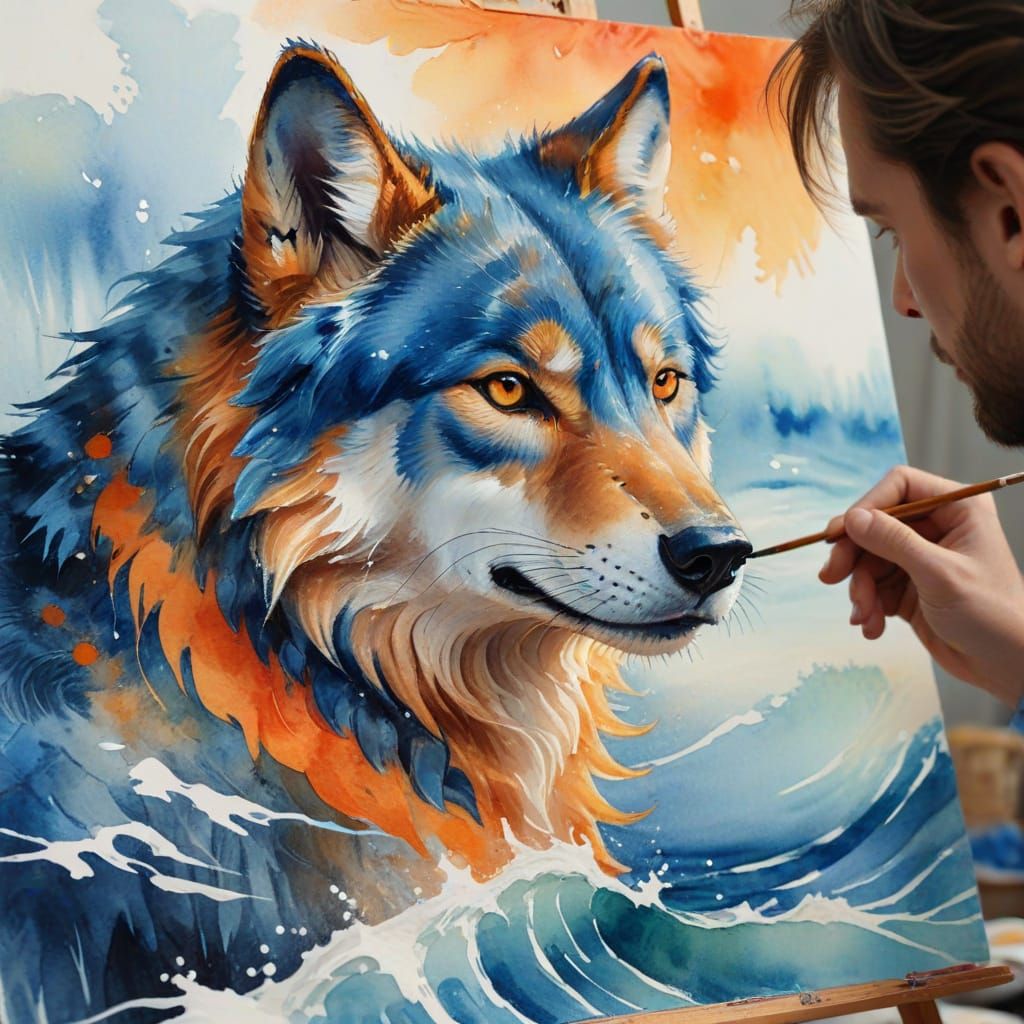 This image shows a painter creating a blue wolf artwork by the sea. It features an impressionistic style with vibrant orange spots and expressive brushstrokes, capturing a dreamy and colorful scene.