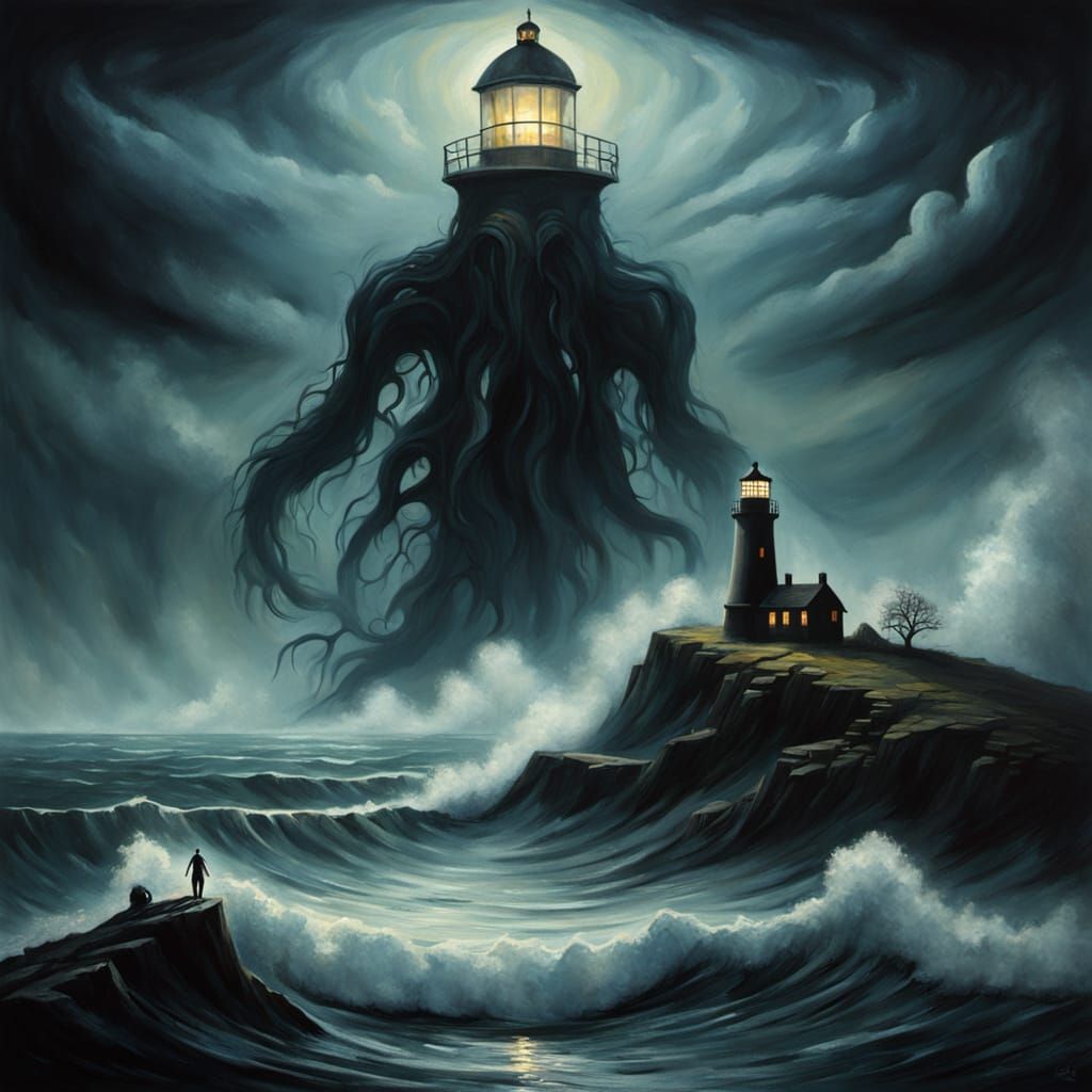 This oil painting shows a shadowy, Lovecraft-inspired creature emerging from a foggy ocean towards a lighthouse, creating a nightmarish scene.