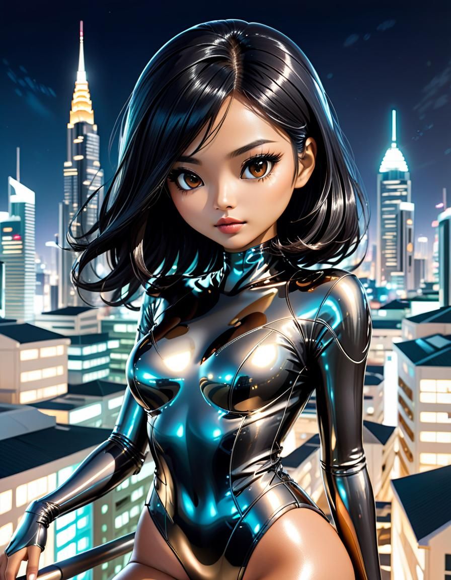 This image shows a cute Indonesian woman in a shiny bodysuit. The digital artwork features a dynamic pose and a retrofuturistic style with a tropical cityscape in the background.