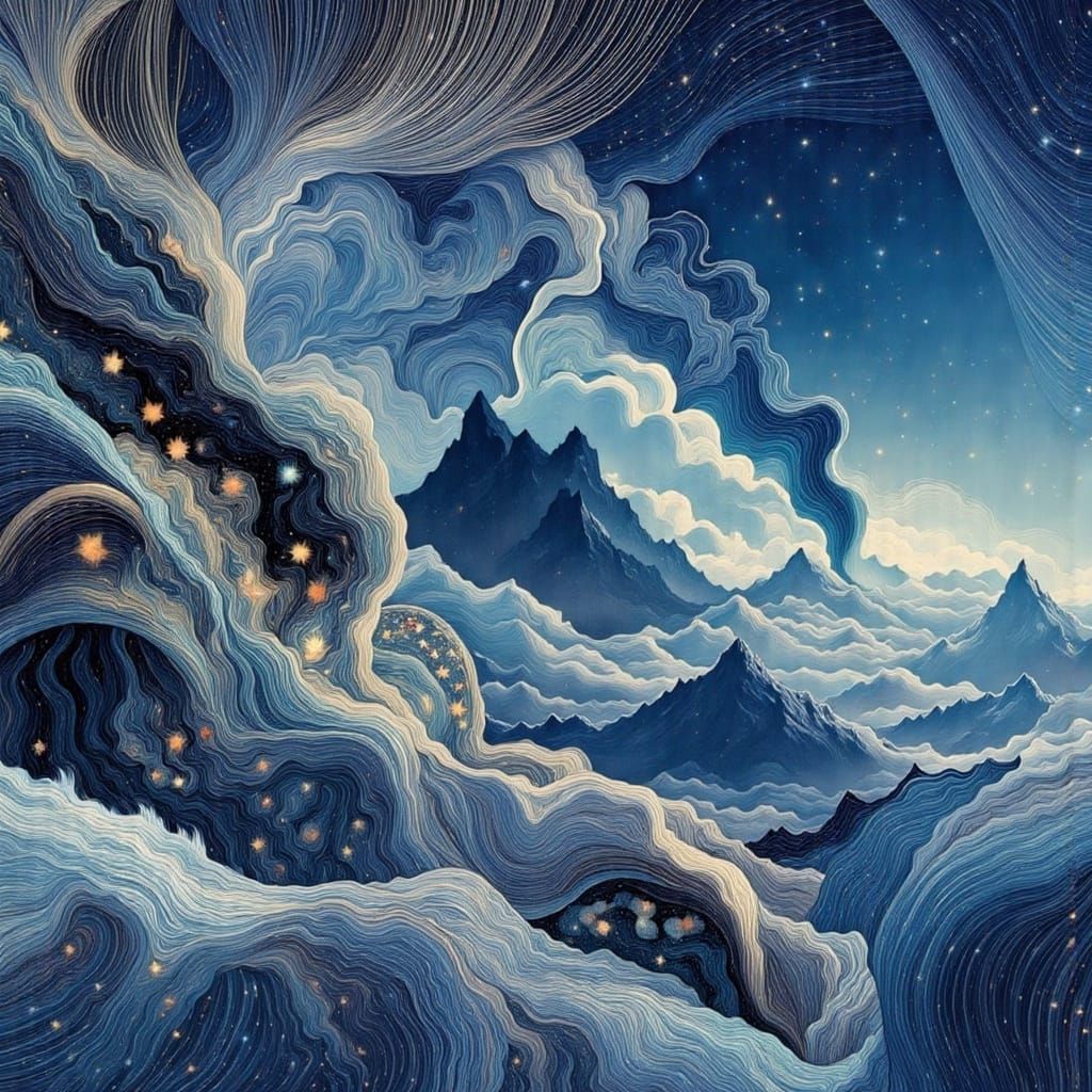 This AI-generated artwork depicts a surreal landscape where imagination shapes reality, transforming dreams into tangible scenes with a digital art aesthetic.
