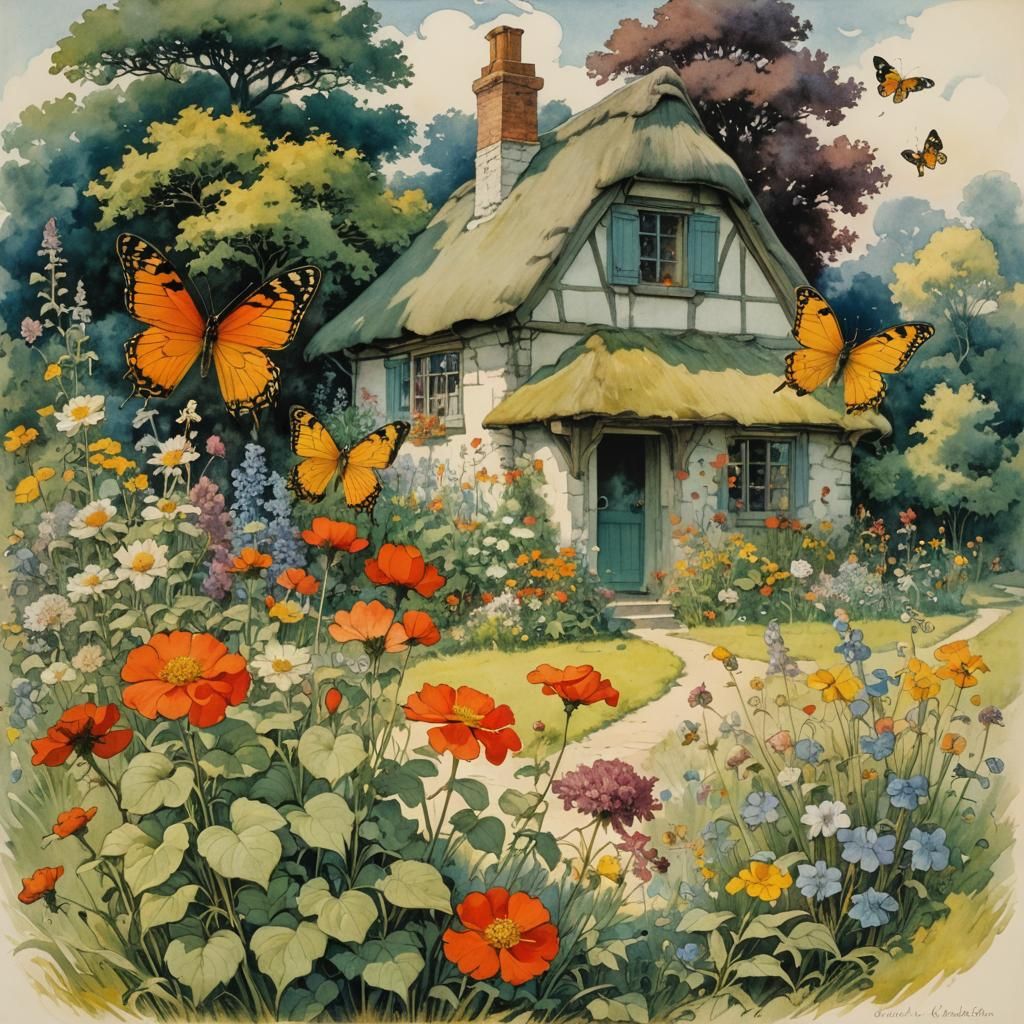A whimsical illustration of a cottage garden teeming with birds, butterflies, and wildflowers, rendered in a detailed, storybook style.