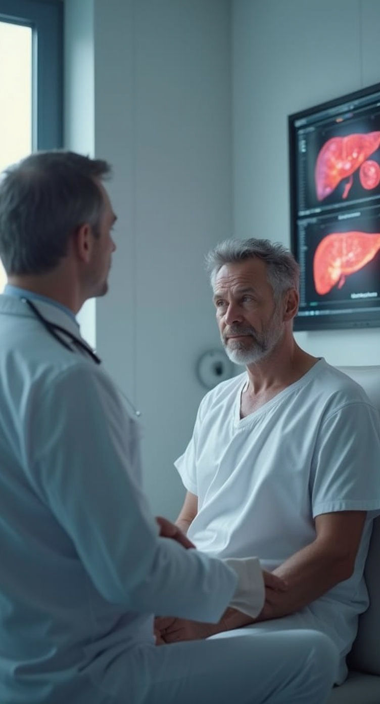 A concerned patient views a liver scan with his doctor, revealing Hepatitis B and liver damage. The image has a cinematic feel and a 35mm film aesthetic with dramatic lighting.