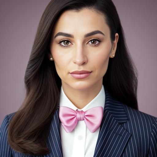 A close-up portrait of a stylish Turkish woman in professional attire. The image captures her wearing a pink pinstripe blazer and silk scarf, reminiscent of professional portrait photography.