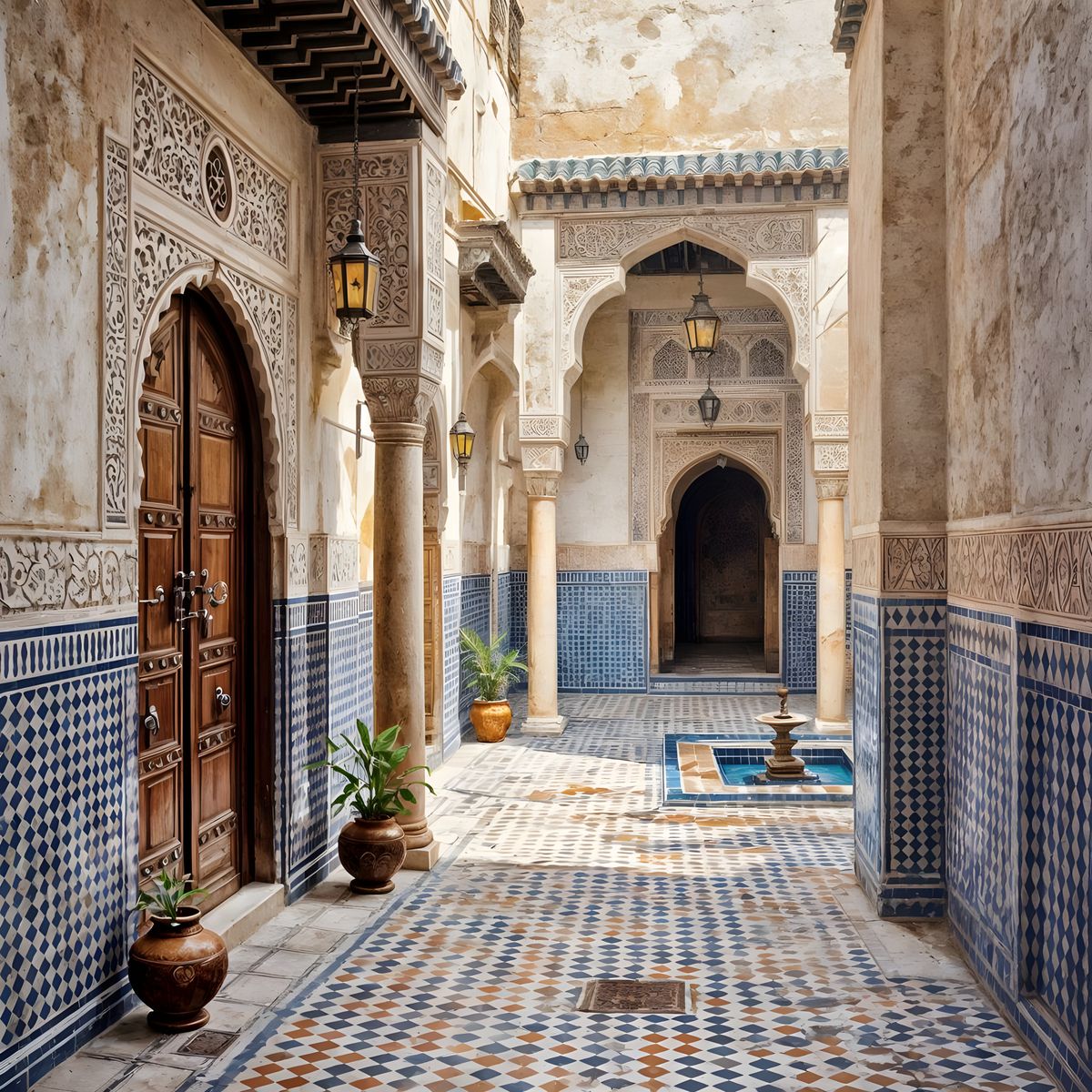 Generate unique AI images of narrow Moroccan alleyways with traditional Zellij tiles and ancient wooden doors. Free and easy to use!
