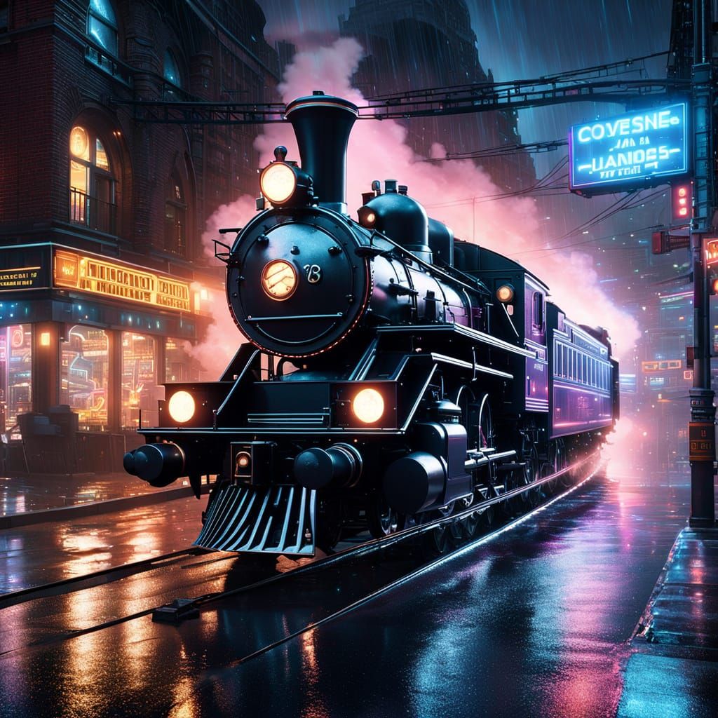 This image shows a vintage steam train dramatically bursting through a portal of swirling light. The train is set against a rain-slicked, neon-illuminated cyberpunk street in a dynamic action scene.