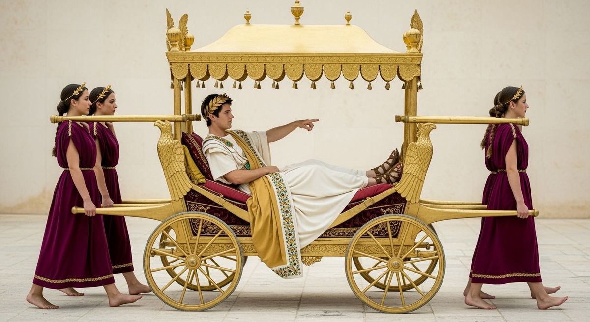 This image shows a young Roman emperor relaxing on a gold litter, carried by servants. He wears a gold toga with emeralds and points forward. The photograph features natural lighting and sharp focus.