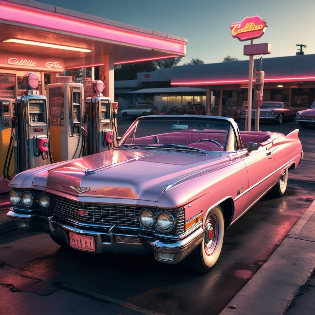 Pink black and chrome cadillac convertible like a vintage gasstation.