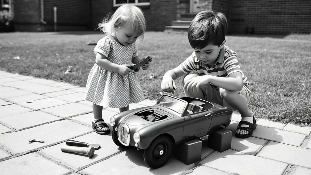 This image captures two young children engrossed in repairing a toy car outdoors. The black and white photograph evokes a nostalgic, vintage feel, highlighting their youthful curiosity and playful spirit.