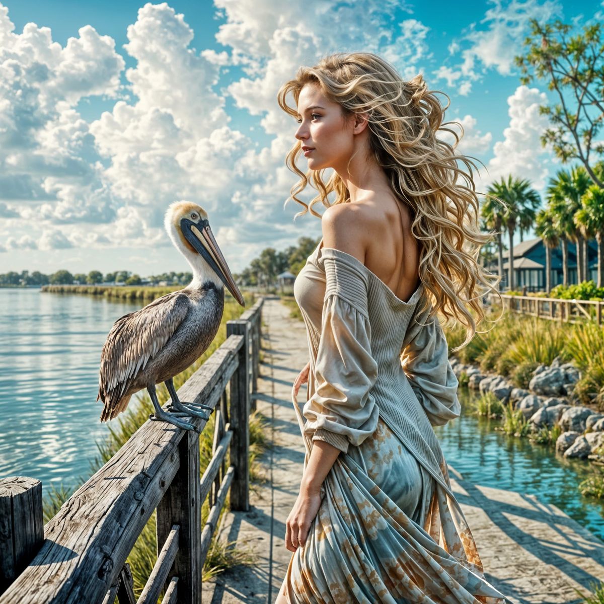 A beautiful young woman photographs a pelican on a boardwalk near the intracoastal waterway, with a blue sky and sunshine. Her blonde hair and sunny nature are highlighted.