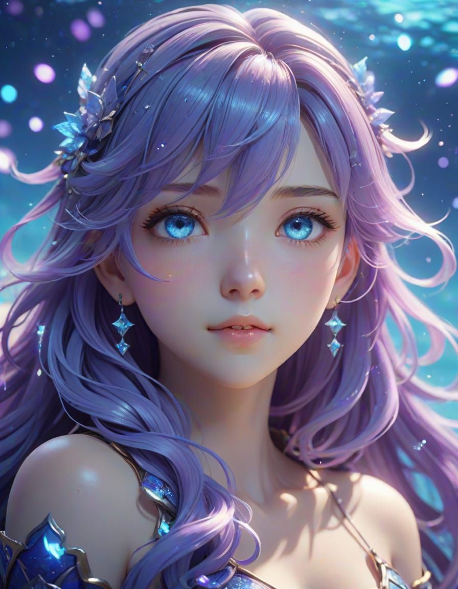 This enchanting portrait features a Pisces maiden with stunning galaxy-colored hair and sparkling ocean blue eyes, set against a shimmering backdrop of water elements and stardust, with delicate fish swimming in the distance, all rendered in exquisite 3D anime art with soft, flowing textures and breathta...