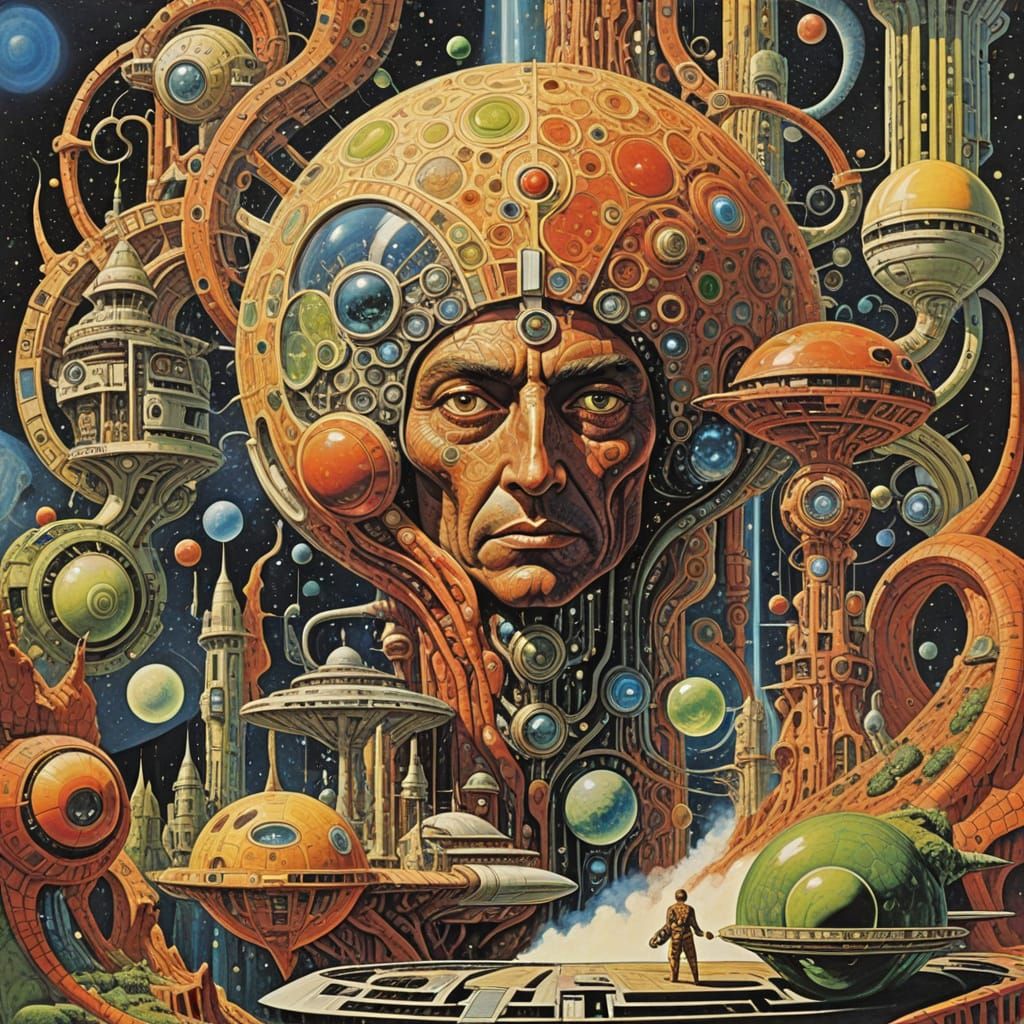 This image shows a man in a vintage science fiction book cover art style. The artwork features surreal and psychedelic elements reminiscent of classic sci-fi illustrations.