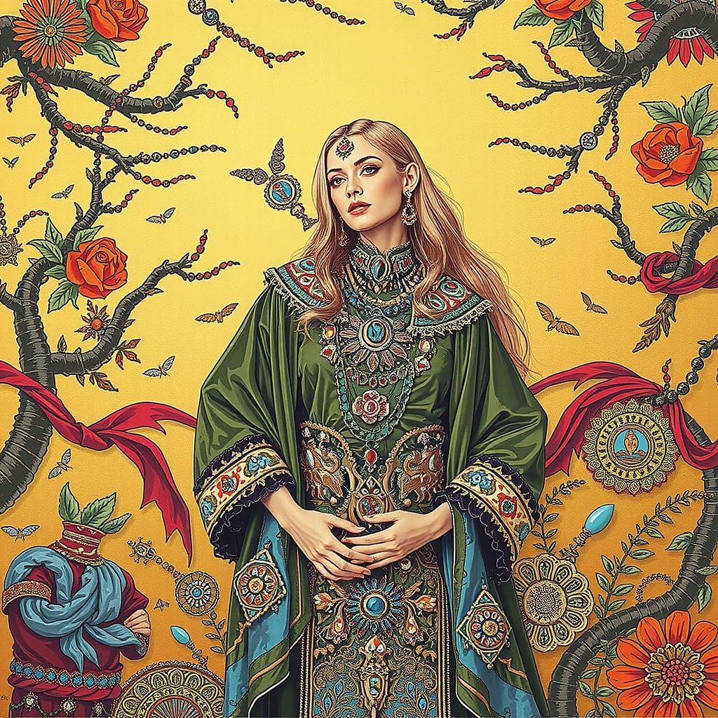 This image shows a woman posing elegantly amidst lavish fabrics and exquisite jewelry. The artwork is reminiscent of dramatic digital art, featuring vibrant colors and meticulous details.