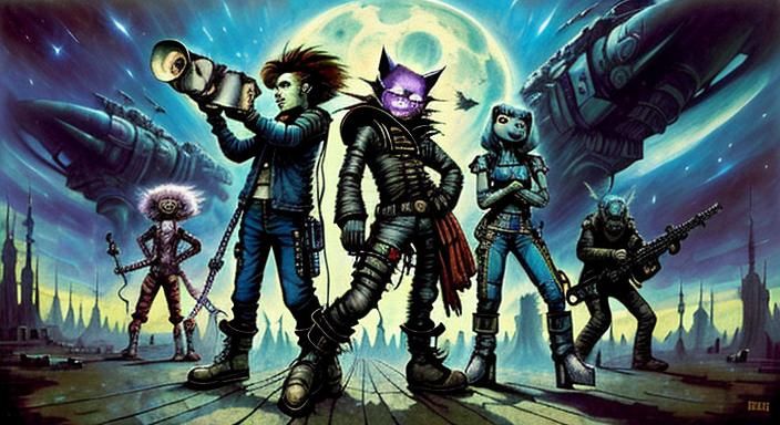 A striking picture of anthropomorphic mercenaries engaged in hi-tech battle action amidst an alien cityscape. This digital artwork features complementary colors, intricate details, and a retro sci-fi aesthetic.