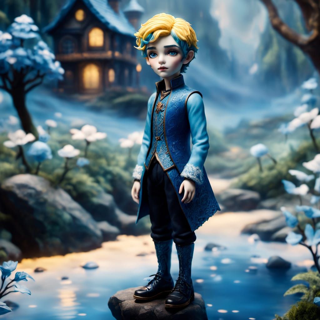 This image shows a full-length portrait of a male porcelain doll dressed in blue, set against a misty backdrop. The artwork evokes a dreamy, ethereal quality with soft, warm lighting.